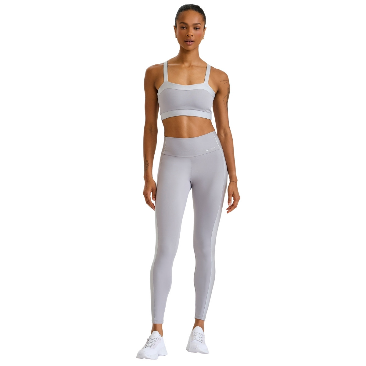 Legging em tecido macio com proteção solar e detalhe de brilho nas laterais, modelagem que proporciona conforto e segurança.