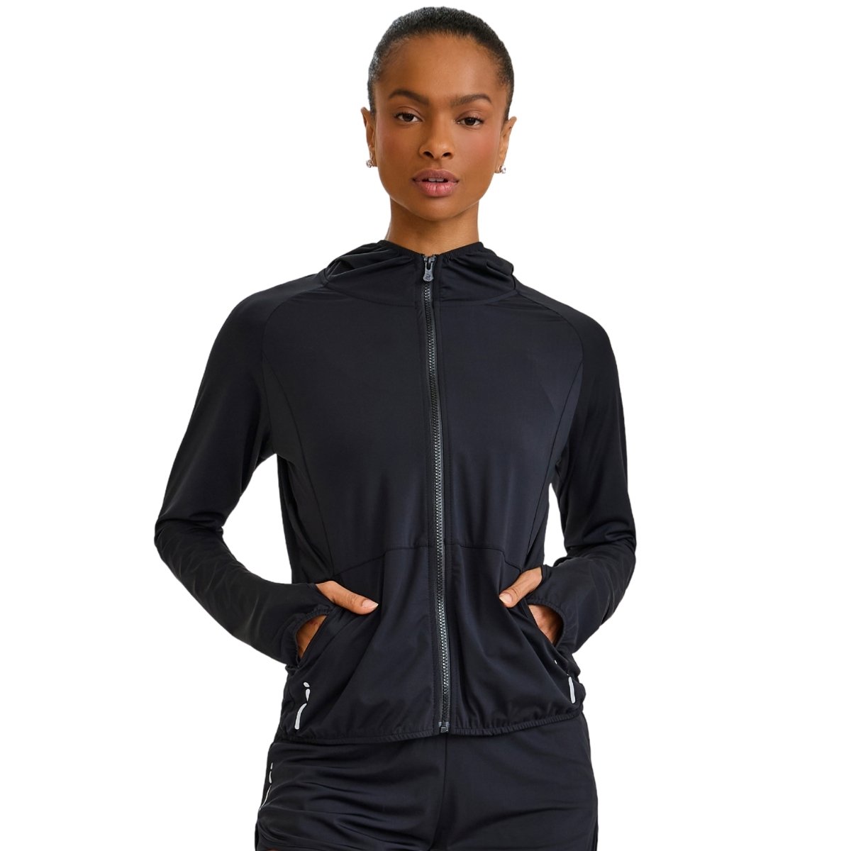 Corta vento em tecido leve, com toque macio e bom caimento, possui bolsos frontais, capuz, fechamento em zíper e abertura estratégica para relógio e dedão.